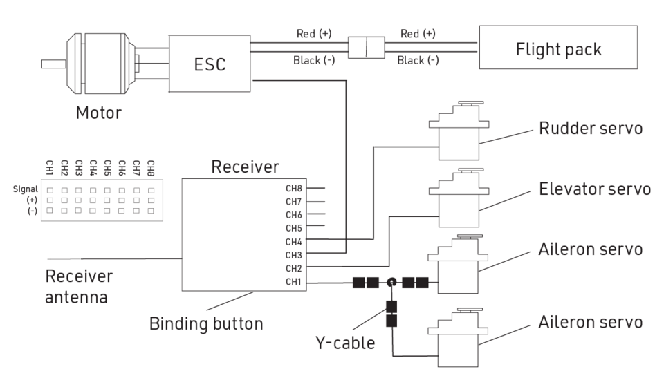 Channel and function Aileron (CH1) Elevator (CH2) Throttle (CH3) Rudder (CH4)