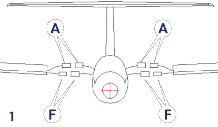 1. Connect the aileron (A) and flap (F) servo cables to the corresponding extension cables in the wing opening in the fuselage. Double-check the correct connection. (Fig. 1)