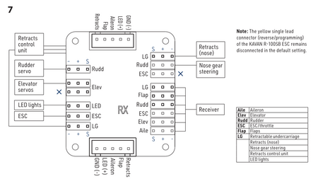 Note: The kit is supplied with the connection board for ailerons, flaps, elevator, rudder, retracts, ESC and LED lights so you can use even the most basic 6-channel radios to control your Skyfox. If you intend to use independent control of aileron and flap servos and an advanced computer radio, you will have to bypass the connection board accordingly. The LED lights are only powered via the connection board; they are not remotely controlled in any way.