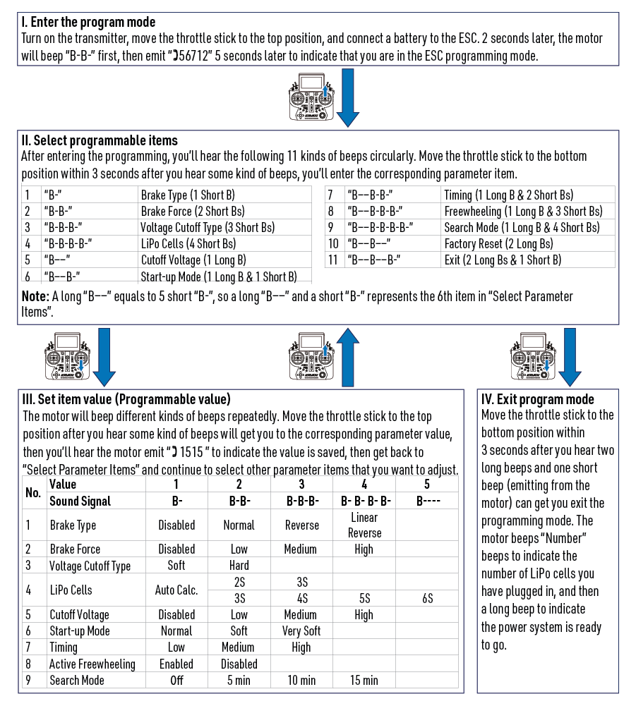 Important: You need to power your ESC off and then on after adjusting the parameters. Otherwise, new parameters won’t take effect.