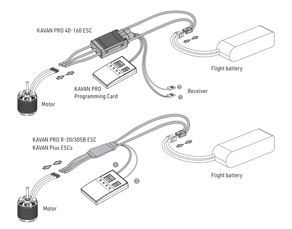 After connecting everything, please connect a battery to your ESC and turn it on. A few seconds later, the KAVAN PRO Programming Card will display the current settings in your ESC. If the programming card doesn’t display anything, then please check if the programming cable and the wire (on UBEC/the extra battery) for powering the KAVAN PRO Programming Card have been reversely plugged in. After confirming all the connections (are correct), disconnect the battery, and 2 seconds later re-connect it to your ESC to see if any information is displayed on the KAVAN PRO Programming Card.