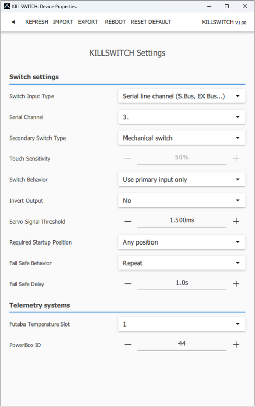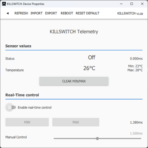 Real-time telemetry with temperature min/max values. By enabling the real-time control, you are able to confirm the correct behavior in response to the input signal value. The MAV Manager is also able to create a log file from the real-time telemetry data, which can be viewed, analyzed, imported and exported. The KillSwitch settings. Every time you make any change in the configuration, the new value is immediately transferred to the device and saved to memory. There is no need for additional confirmation.