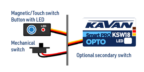 Congratulations on purchasing the KAVAN Smart PRO KSW18 Kill switch, a high-performance digital switch featuring an optically isolated switching circuit. Thanks to its excellent noise immunity and signal separation, it is ideal for use as an independent ignition switch. It can be controlled via an RC channel, a mechanical switch, or both. The device offers a range of configurable options for flexibility in various setups.