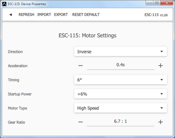 It is possible to configure many of the motor parameters, including acceleration, timing, motor gear ratio or number of poles. The gear ratio and number of poles are important for telemetry to measure the motor speed correctly.