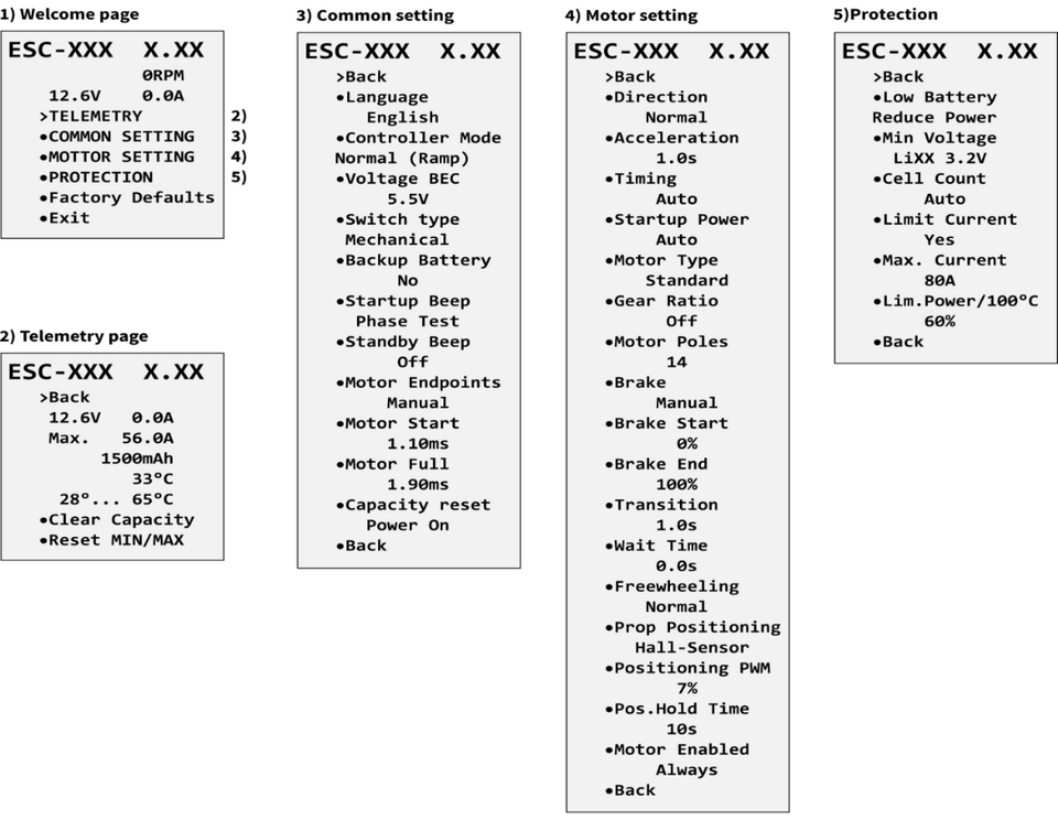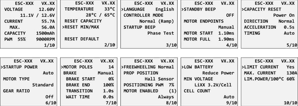 • Telemetry (depending on RC system): voltage, current, power, capacitance, temperature, speed, energy.