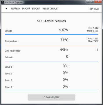 - Ch.1–Ch.4 - Here you can set the properties of each output channel. You can modify the receiver channel assignment to the outputs of the SE4. By pressing both left+right buttons, you can change the behavior if there is no signal on the serial line: