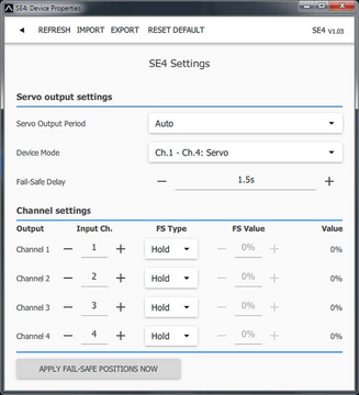 Congratulations on purchasing the KAVAN Smart PRO SE4 4ch BUS servo decoder, a device that converts serial bus signals to standard PWM servo outputs. It offers up to four configurable servo outputs with optional period and fail-safe settings. The SE4 is a perfect choice for models with complex wing or tail mechanics where multiple servos may be connected to a primary receiver using just a single cable. In addition, if you are running out of receiver channels simply connect the SE4 to the receiver serial line and freely assign its own output channels.