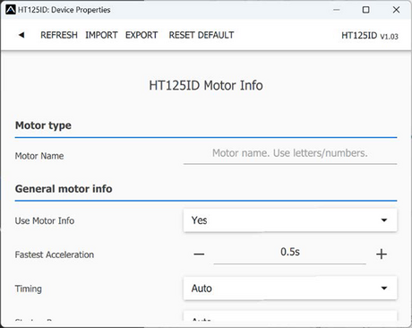 - Motor Info – settings related to motor identification (Temp125C only). If you enable this option, the configured motor parameters will be available to the Smart PRO controller.