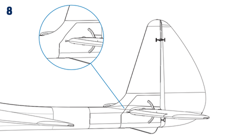 - With your radio on, set the elevator servo to the neutral position; adjust the length of the elevator control linkage to the centre of the leading edge of both two all-moving tailplane halves to match the triangular mark on the fuselage. (Fig. 7+8)