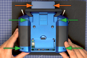 Now loosen the ratcheting strip [1] (adjusts the ratchet strength) and the tension strip [2] (the more you loosen it, the easier it is to move the stick), then check that the gimbal can move freely in all directions.
