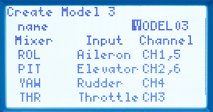 When creating a new model, use UP and DOWN buttons to navigate through name option and pre-assigned channels.