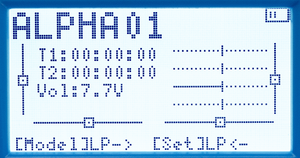 This is the default screen during operation or idling. It displays the model name, trim values, current channel output values and the remaining radio battery charge.