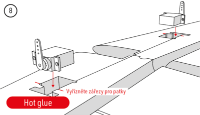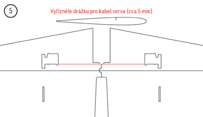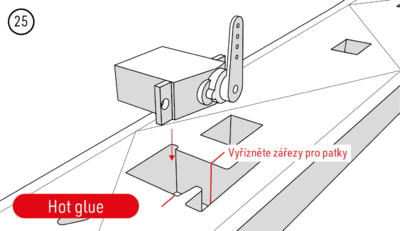 - Po úplném sestavení modelu zapojte palubní RC vybavení a přezkoušejte činnost serv - správný smysl a velikost výchylek. Pokud má některé kormidlo příliš velké výchylky, posuňte táhlo na páce serva blíže ke středu (nebo na páce kormidla dále od kormidla). Pokud by naopak výchylka byla příliš malá, postupujte právě opačným způsobem.