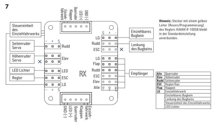 - Schließen Sie Ihren Empfänger gemäß dem Schema (Abb. 7) an. Befestigen Sie den Empfänger mit den angeschlossenen Servos und dem Drehzahlregler mit einem Klettband oder einem doppelseitigen Schaumstoffklebeband im hinteren Teil der Kabine. Positionieren Sie die Antennen so, dass ihre aktiven Teile im 90 Grad Winkel zueinander stehen (wenn Sie einen Diversity-Antennenempfänger haben).Bemerkung: Standardmäßig werden die Querruder-, Klappen-, Seitenruder-, Höhenruderservos, das Einziehfahrwerk und der Regler über eine spezielle Anschlussplatte im Modell an den Empfänger angeschlossen, so dass auch die einfachsten 6-Kanal-RC-Sets zur Steuerung des Modells verwendet werden können. Wenn Sie die unabhängige Steuerung von Querrudern und Klappen verwenden wollen, wie sie die fortgeschrittenen Computer-RC-Sets ermöglichen, müssen Sie den Anschluss der Bordelektronik entsprechend anpassen. Die LED-Lichter werden nur von der Anschlussplatte versorgt. Sie werden in keiner Weise ferngesteuert.